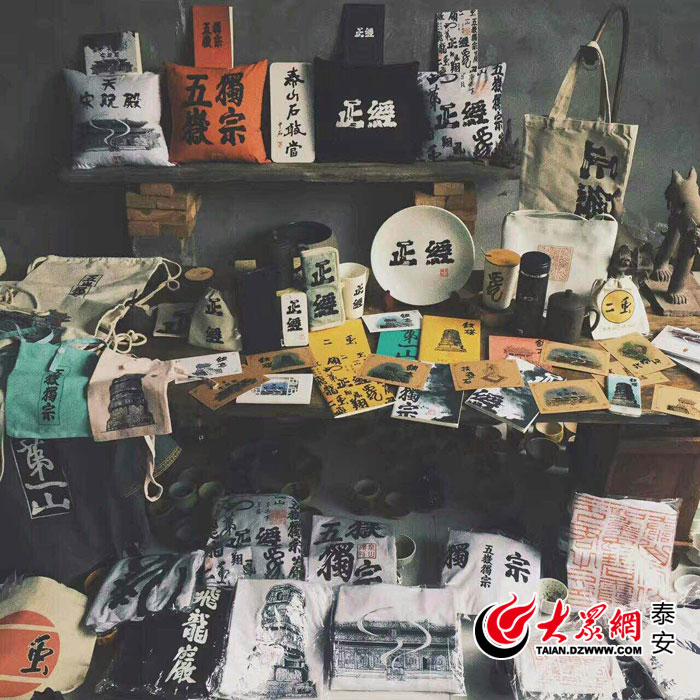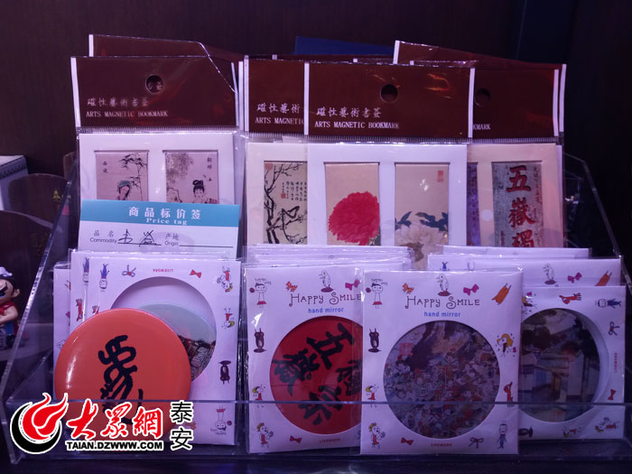 喜歡岱廟的漢柏、石刻和碑刻,喜歡宋天貺殿上的《泰山神啟蹕回鑾圖》壁畫,可它們卻很難被珍藏。直到,我在岱廟里一個展架上找到了“泰山禮物”。馬克杯、化妝隨身鏡、鼠標墊、帆布包、書簽、明信片等,6個系列26款手伴紀念品,全是帶有泰山元素的文化創意產品。