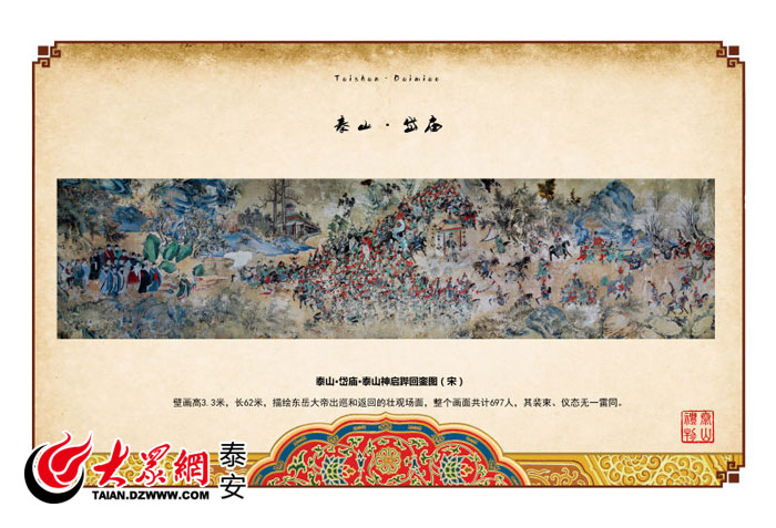最實用的伴手禮,應該是一面小小的化妝隨身鏡。鏡身共有13種圖案,以岱廟的碑刻、壁畫為題材設計制作,質地精細,尺寸卻只有手心大小,收進隨身口袋都不易察覺。有一款鏡身,做的是《泰山神啟蹕回鑾圖》的壁畫圖案,打樣精良、輪廓細膩,每一個人物都栩栩如生,又氣勢恢宏。后來才知道,天貺殿內的大型壁畫是不允許拍照的,不買一面回去,確實可惜。
