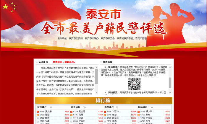 泰安“全市最美戶籍民警”評選。經過層層選拔,最終確定了52名優秀戶籍民警作為此次推選活動的候選人。此次投票堅持“公開、公平、公正”和“群眾參與、把評判權交給群眾”的原則。網友可登錄大眾網泰安頻道投票專題頁面或者關注泰安大眾網官方微信(點擊進入投票網址:(http://tp.dzwww.com/2017/tahjjc/),關注"全市最美戶籍民警"投票活動。