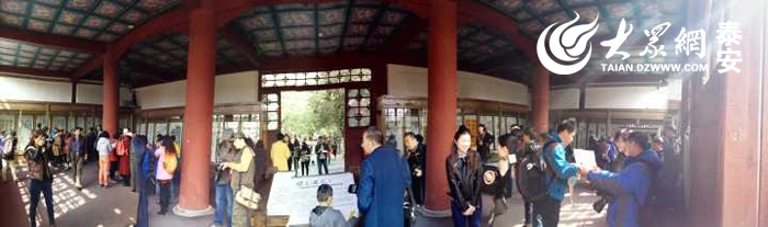 大眾網泰安3月25日訊(記者 趙偉)3月25日,泰安岱廟配天門殿里人頭攢動,在一幅展出的春日主題國畫前,泰安市民盛女士正為孩子詳細解釋著工筆畫和寫意畫的區別。當天上午,由大眾網、岱廟主辦的《獨立煙嵐——首屆網媒中國書畫名家名作邀請展》在這里舉行,大眾網邀請的十三位國內書畫名家攜46幅書畫佳作,為泰安市民和游客奉獻上了一道豐盛的文化藝術大餐。