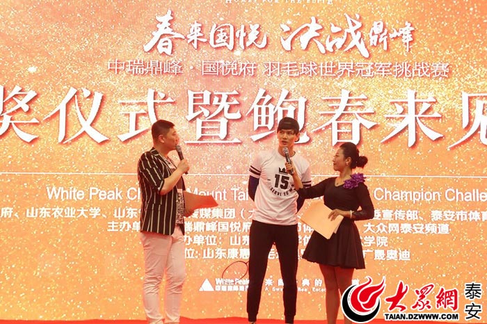 大眾網泰安4月15日訊(記者 趙國帥 王蓬波)4月15日下午,山東農業大學體育館內座無虛席,氣氛高漲,由泰安市體育總會、省網媒集團泰安分公司指導,中瑞鼎峰國悅府、大眾網泰安頻道主辦的“春來國悅 決戰鼎峰”羽毛球世界冠軍泰山挑戰賽頒獎儀式在這里舉行,世界冠軍、國家羽毛球隊原隊員鮑春來應約來到賽事現場為各組別冠軍頒獎,上千網友觀眾與鮑春來互動嗨翻全場,鮑春來的精湛球技也引起現場尖叫聲不斷。