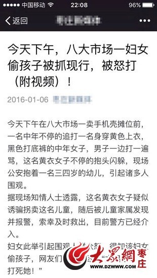 朋友圈微信瘋傳“八大一婦女偷孩子被怒打”,同一消息在全國(guó)多地傳播。