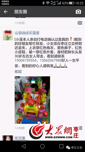 朋友圈轉(zhuǎn)發(fā)的“棗莊立交橋女童丟失”的信息