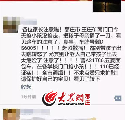 3月20日左右,棗莊市民的朋友圈里又出現(xiàn)一則驚人的消息:有人在棗莊王莊搶孩子,還有家長(zhǎng)被捅傷。棗莊警方于3月21日進(jìn)行辟謠,表示并沒(méi)有接到類似警情,該消息為謠言。