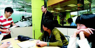 小雨(右1)和父母到麥當勞討說法,麥當勞一工作人員(左1)表示,自己不能對此事作任何回應 ■本報記者 蕭石逸 攝