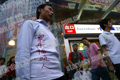 記者18時趕到家樂福方莊店時,羅先生身穿白色背心站在超市入口附近,在背心的前后各寫著兩行紅色標語:“賣過期啤酒,家樂福坑人。”“這人下午4點多就來了,好像超市沒給解決,所以老是不走。”在附近旁觀的侯先生說。