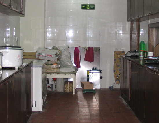 在去洗手間時,沿著店內張貼的衛生間導向標示,恰巧就走進了這家店的廚房。在廚房中,我們看到了熨衣板、破紙殼箱、面粉、地秤、抹布、圍裙、竹筐、電飯煲、用過沒用過的方盤、餐盒堆放在一個房間內。通過一個傳菜的窗口我們看到幾把爛拖布倒放在洗池邊上。這樣臟亂的廚房與店家宣傳的“ISO9001國際認證企業”著實相距甚遠。在廚房中我們拍下了幾張照片,在拍完照走出廚房之時才有人過來問“你們干什么?這是廚房不許拍照!”
