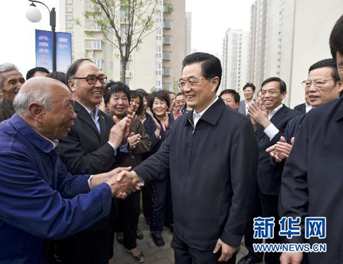 4月29日至5月1日,中共中央總書記、國家主席、中央軍委主席胡錦濤在天津考察工作。這是胡錦濤在保障性住房小區秋怡家園親切看望居民,了解他們的住房改善情況。新華社記者 李學仁攝