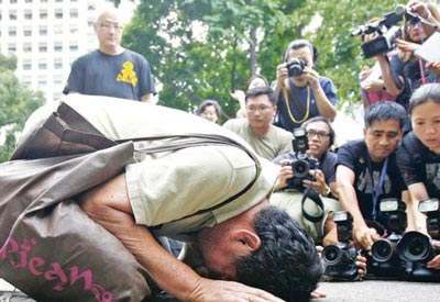 圖為于中環企圖跳橋的劉某獲救后,知悉有警員在事件中殉職,向死者家人叩頭