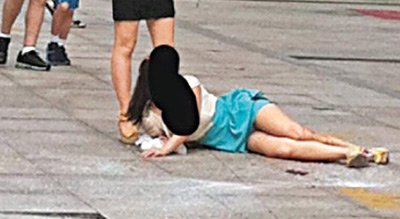 慶春發展大廈樓下農業銀行門外,一個白衣綠裙女孩倒在地上,尖叫哭喊,左腿后方從膝蓋到小腿像是被削掉了一塊,血肉模糊,地上一大灘血,周圍全是散落在地上的玻璃碎渣。地上有一袋包子和一袋牛奶,旁邊還有一個穿黃衣服的女孩。