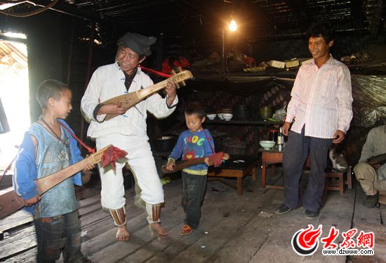 怒族舞蹈中的達比亞舞是以一種形似琵琶的彈撥樂器作為伴奏,歐得得就是伴奏者,他善于彈唱,能給大家?guī)須g樂。歐得得家在山上,茅草頂,草席墻,日常的生活必需品都需要到山下購買,然后用竹筐背上山。房子是竹木結構,屋內的裝飾也很簡單,墻上掛著的幾支野羊角,羊角上的蛋殼,墻邊的木柜,歐得得的生活簡單而質樸。歐得得正在彈奏的樂器叫達底達變,是祖輩們傳下來的四弦樂器,彈奏的位置多變,姿態(tài)豐富,可以高彈低彈,上彈下彈,反彈正彈。在表現形式上,由歐得得的伴奏的達比亞舞分為單人、雙人、集體等多種形式。這是歐得得正和他的妻子一起表演怒族的情歌對唱。歐得得會六十余種歌舞,他的舞步節(jié)奏穩(wěn)健,以膝關節(jié)帶韌性的屈伸顫動為主,再加上腳的動作,讓他練就了一雙鐵腳板,門口處的木地板就是歐得得家永不閉幕的舞臺。他希望有更多的人了解達底達變,好讓這古老的舞蹈傳承下去。