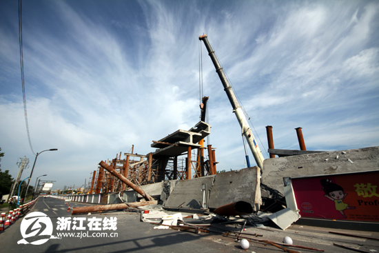 被震落的橋面、鐵管倒向了德勝東路北側,占據了進城方向的兩個車道,杭州公交集團在傍晚調整了B支4路、103路等7條公交線路。德勝路往下沙方向未受影響。