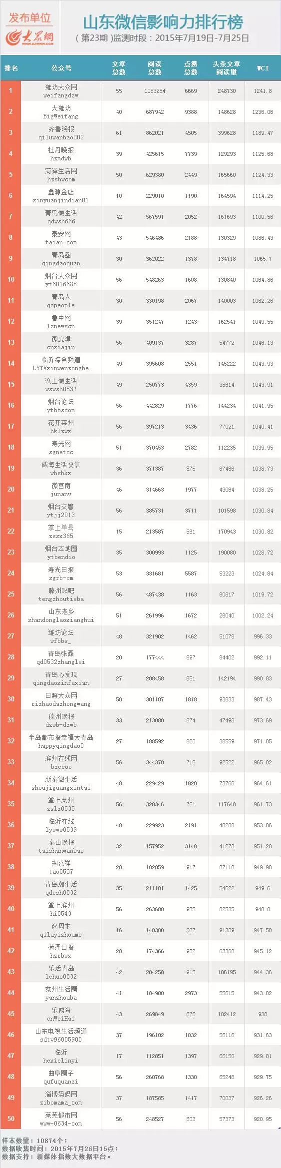 本期山東微信影響力排行榜前兩名由來自濰坊的兩個賬號“濰坊大眾網”和“大濰坊”奪得,“濰坊大眾網”依舊以閱讀總數過百萬的傲人成績領銜榜單。前十名上榜賬號中排名進步較大的有“鑫源金店”和“煙臺大眾網”,他們憑借兒童白血病防范和菜市場電子稱的貓膩等話題分別進步30個和18個名次。與上期相比,“汶上微生活”、“掌上單縣”、“青島張磊”、“青島心發現”、“濱州在線網”、“淘嘉祥”、“掌上濱州”、“菏澤日報”、“樂活青島”、“山東電視生活頻道”、“萊蕪都市網”等11個賬號新入50強。熱門文章榜中三輪車撞上路虎、濟寧兩名女童失蹤、有毒多寶魚等主題集中出現。