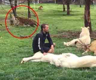 ▲你給我鏟屎,我護(hù)你周全。近日,墨西哥一名飼養(yǎng)員,與獅子玩耍時(shí)險(xiǎn)被一只豹子“從后偷襲”,所幸其身后另一只老虎出手幫他擋住撲過(guò)來(lái)的豹子(圖)。不過(guò)也有網(wǎng)民指出,該處是“大貓”們的庇護(hù)所,這只花豹其實(shí)只是鬧著玩。(環(huán)球網(wǎng))