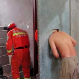 ▲囧!近日,江蘇43歲的張先生因嗜酒如命,被妻子關(guān)進(jìn)了自家的小黑屋反省。激動(dòng)的張先生把頭探出門鎖,不了卻被卡住,無(wú)法動(dòng)彈(圖),后請(qǐng)求消防官兵救援才得以解脫。(東方網(wǎng))