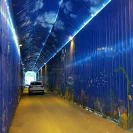 ▲美翻了!近日,濟南一小區入口處因施工而用鋼板搭起了一個臨時的通道供車輛行人安全通行,但在這簡陋的臨時施工通道上,有人描繪成了一個絕美的海底隧道(圖),行走其間讓人感覺十分夢幻。(大眾網)