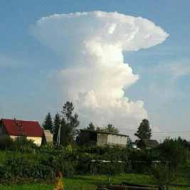 ▲嚇壞了!近日,西伯利亞工業城市Kemerovo上空突現一朵巨大的蘑菇云(圖),令當地居民受驚不小。不少居民誤以為發生了核爆,事實上這是一朵形狀奇特的“鐵砧積雨云”,通常是因為雷暴將云層推向大氣層高處而形成的。(環球網)