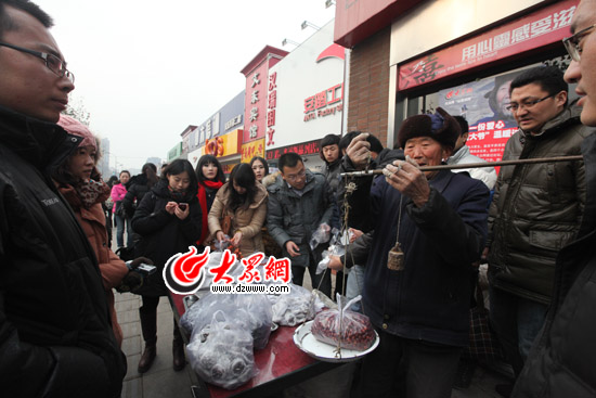 在文化東路六乃喜快餐店門口,大爺的攤子剛剛擺上,就被過路的行人和特意前來的網友圍住了,大家紛紛上前購買“綠色山貨”,大眾網的五六位記者不斷地幫著大爺裝袋、收錢,過稱……盡管今天的氣溫很低,但大家不一會兒就忙出一身汗來。