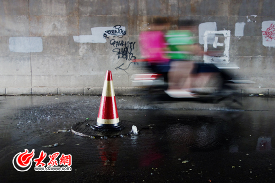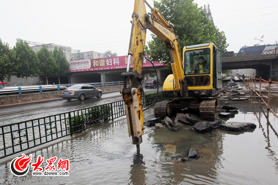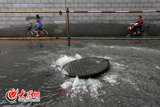 大眾網記者發(fā)現,在歷山路鐵路橋西側還有一處“噴泉”, 非機動車道上一個井蓋被地下水道的積水頂了起來,自行車和行人只能淌水經過。在井蓋附近約兩百米的路段上,一輛挖掘機正在進行施工。施工人員告訴記者,他們正在進行管道改造和安裝排水泵。“一下暴雨,水都流進下水道了,來不及流走就容易把井蓋頂起來。排水泵安好了,就能及時排走這些積水。”