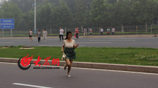 記者趕到時(shí)為早上8點(diǎn),正值上班早高峰,此時(shí)有30余名年輕男女從經(jīng)十東路南側(cè)的小路上排隊(duì)走下,聚集在馬路的南側(cè)等待。等了約一分鐘后,眼看路面車輛變少,這30多人幾乎同時(shí)向馬路中間的護(hù)欄跑去。而腿腳慢了些的,則被疾馳而過的汽車攔在路中間的機(jī)動(dòng)車道上,進(jìn)退兩難,只能在汽車?yán)鹊拇叽僦胁煌6汩W。