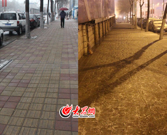 在濼源大街同一路段,右圖為13日晚上的積雪情況,左圖顯示14日上午積雪已經全部融化。(赫洋 攝影)