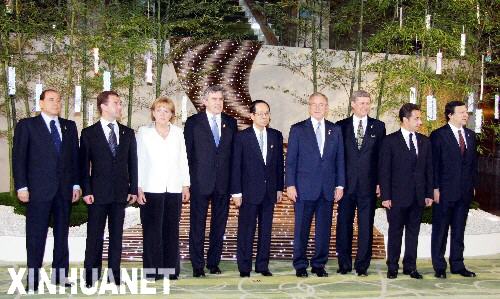 7月7日,在日本北海道洞爺湖,參加八國(guó)集團(tuán)首腦會(huì)議的領(lǐng)導(dǎo)人在竹子裝飾前合影,從左至右依次為意大利總理貝盧斯科尼、俄羅斯總統(tǒng)梅德韋杰夫、德國(guó)總理默克爾、英國(guó)首相布朗、日本首相福田康夫、美國(guó)總統(tǒng)布什、加拿大總理哈珀、法國(guó)總統(tǒng)薩科齊和歐盟委員會(huì)主席巴羅佐。 新華社發(fā)