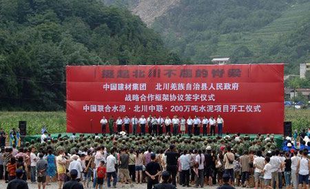 “這是北川災后重建工程啟動的第一個大項目,標志著北川縣災后重建工作全面啟動。”北川縣委書記陳興春說。中國建材集團董事長宋志平說,災后重建,建材要先行。在災后重建時期,建材產品的需求量會在短期內急劇增加。為保障災后重建水泥的需要,中國建材集團與北川縣簽署了戰略合作框架協議,以解決北川縣災后重建所需的建筑材料的供應問題。