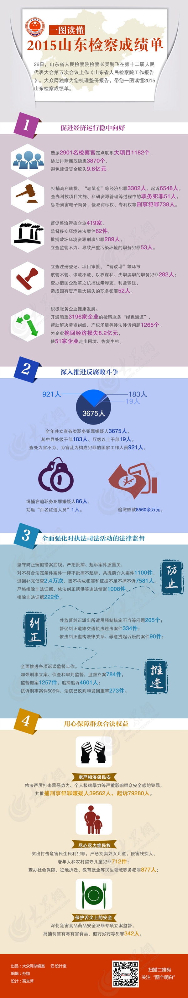 大眾網1月26日訊(記者 孫翔) 26日,山東省人民檢察院檢察長吳鵬飛在第十二屆人民代表大會第五次會議上作《山東省人民檢察院工作報告》。大眾網獨家為您梳理整份報告,帶您一圖讀懂2015山東檢察成績單。