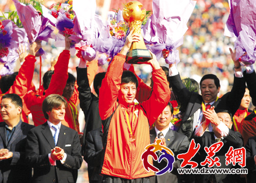 10月29日,中超聯(lián)賽頒獎(jiǎng)儀式在山東體育中心進(jìn)行,山東魯能足球隊(duì)隊(duì)長(zhǎng)舒暢舉起中超冠軍獎(jiǎng)杯——火神杯,鄭智、李金羽羽及圖巴分獲最佳球員、最佳射手和最佳教練稱號(hào)。作為今年中超聯(lián)賽的金牌球市,魯能隊(duì)所在的濟(jì)南賽區(qū)榮膺今年中超聯(lián)賽最最佳人氣獎(jiǎng)。 |