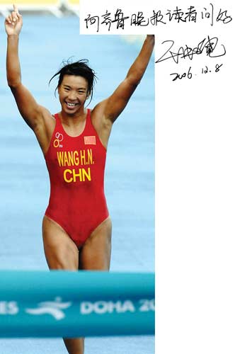 王虹霓沖向終點。賽后向本報讀者問好。 本報訊 2006年多哈亞運會進入第七天,中國軍團在多個優勢項目上遭到阻擊,但奪金勢頭依然不減。截至北京時間9日0點,中國代表團的金牌數已經達到94枚。 多哈亞運會女子鐵人三項結束爭奪。來自山東濟南的王虹霓一路領先,以1小時59分44秒27奪得了在亞運會歷史上的首枚鐵人三項金牌。 在女子鏈球的決賽中,中國選手張文秀獲得冠軍。跆拳道女子47公斤級比賽中,中國選手吳靜鈺奪冠。 在健美比賽中,中國選手的收獲依然不少,健美男子60公斤級決賽中,中國選手錢吉成獲得冠軍。 花樣游泳雙人賽競爭激烈,中國隊雙胞胎姐妹蔣文文、蔣婷婷以96.584的總分獲得冠軍。 斯諾克單人賽決賽在兩位中國選手丁俊暉和梁文博之間進行,最終經過六局較量,丁俊暉以4∶2戰勝梁文博將金牌收入囊中。小暉也憑借團體、雙人和單人這3枚金牌成為了本屆亞運會斯諾克比賽的“大滿貫”得主。
