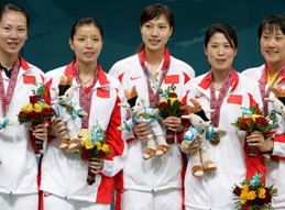 多哈當地時間12月5日,亞運會羽毛球女團決賽中國隊以3-0戰勝日本隊,摘得首枚羽毛球金牌。詳細比分及對陣如下:張寧2-0 森香織(21-13,21-15)、楊維/張潔雯 2-0 小椋久美子/潮田玲子(21-8,21-15)、謝杏芳 2-0 廣瀨榮理子(21-12,21-15)。圖為賽后頒獎儀式中國隊隊員與教練合影。