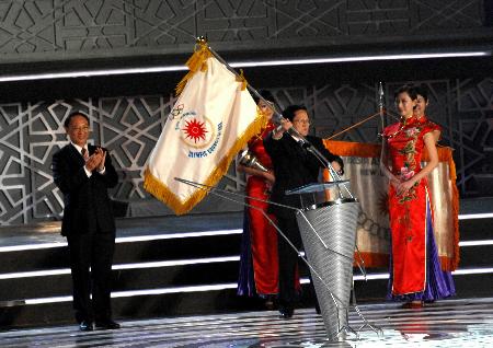 多哈組委會主席(卡塔爾王子)致辭后,亞奧理事會主席法赫德親王致閉幕辭,隨后進入會旗交接儀式,在雄壯無比的中華人民共和國的國歌聲(廣州交響樂團演奏)中,五星紅旗升了起來,法赫德親王把亞運火炬交給了中國國家體育局局長劉鵬,而后再轉(zhuǎn)交給廣州市長張廣寧,而后轉(zhuǎn)交的是1951年首屆亞運會的會旗,最后轉(zhuǎn)交的是亞奧理事會會旗,張廣寧舞動著會旗,此后的四年,亞洲體育的焦點將轉(zhuǎn)移到中國的廣州。