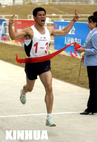 10月22日,廣東隊劉炎立沖過終點線后舉手慶賀。當天,在第十屆全國運動會現代五項男子團體接力賽中,廣東隊以5560分獲得冠軍,上海隊和湖北隊分別以5280分、5192分的成績獲得二、三名。現代五項共包括射擊、游泳、擊劍、跑步和馬術五項比賽。