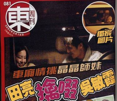 據(jù)16日出版的香港《東周刊》報道,田亮與郭晶晶的雙人項目搭檔師妹吳敏霞3月11日晚在田亮車中“幽會”,雜志封面上還配發(fā)了兩張?zhí)锪梁蛥敲粝荚谝黄鸬恼掌疖幦淮蟛ā?BR>
