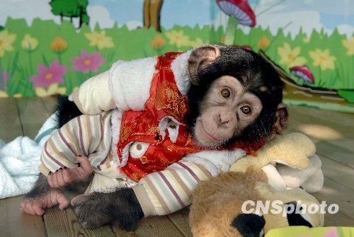 1月12日,冷空氣持續來襲,廣州香江野生動物世界特意為精靈可愛的黑猩猩四毛量身定做了一件唐裝棉襖度過冬天。中新社發 劉衛勇 攝