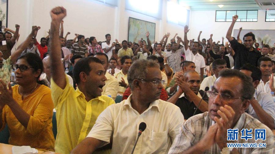 2月8日,在馬爾代夫首都馬累,馬前總統(tǒng)納希德(前左二)與其支持者一同高呼口號(hào)。當(dāng)天,納希德在辭去馬爾代夫總統(tǒng)職務(wù)后首次公開露面,與數(shù)千名支持者在首都馬累集會(huì)。納希德在集會(huì)上發(fā)表演講說(shuō),軍方和警察7日使用武力逼迫他下臺(tái),這是一起政變,他拒絕承認(rèn)新就任的總統(tǒng)瓦希德,要求他下臺(tái)。新華社記者車宏亮攝