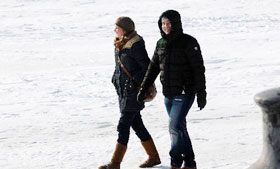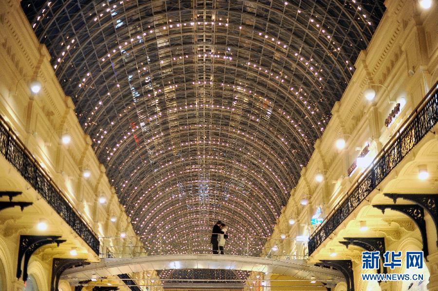 2011年2月22日,一對情侶在俄羅斯首都莫斯科紅場的國營百貨商店擁吻。新華社/法新(程婷婷、戴天放編輯)