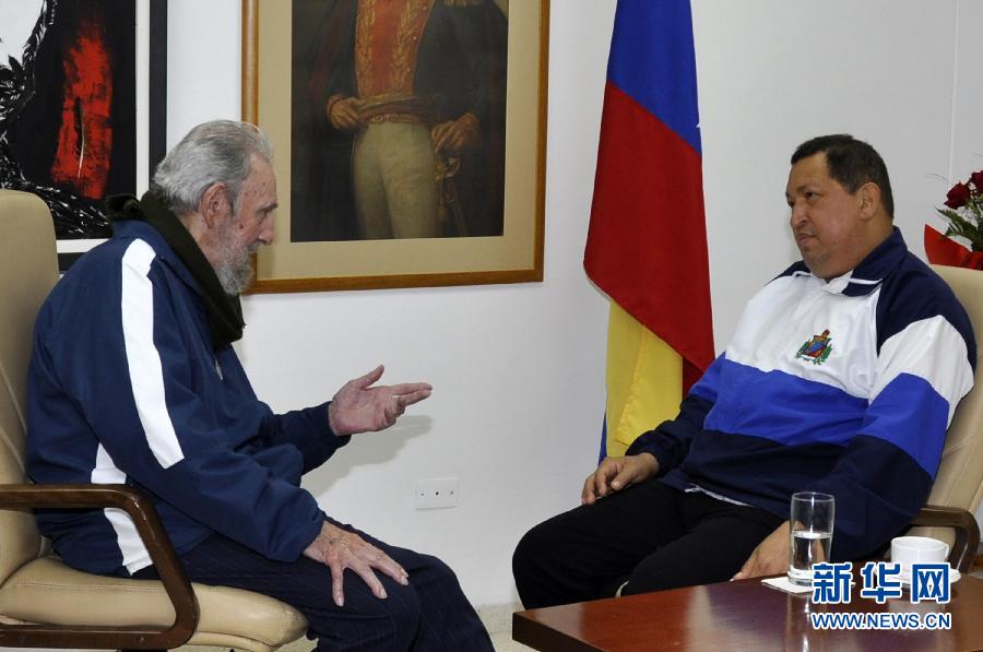 3月2日,在古巴首都哈瓦那的一所醫院,古巴革命領導人卡斯特羅(左)會見在此接受治療的委內瑞拉總統查韋斯。