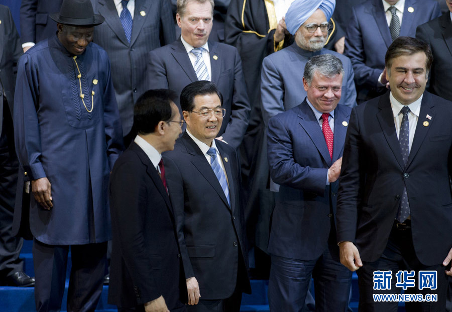 3月27日,中國國家主席胡錦濤在首爾出席核安全峰會。這是與會領導人集體合影。 新華社記者 黃敬文 攝