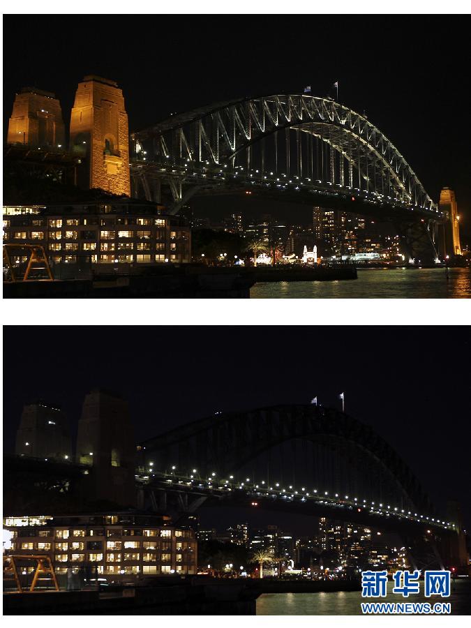 這張上下拼圖顯示的是3月31日晚,澳大利亞的悉尼海港大橋熄燈前后的情景。當天,澳大利亞悉尼參與了“地球一小時”熄燈活動。晚上8點30分,悉尼海港大橋以及悉尼歌劇院同時關(guān)閉了所有的裝飾燈,以響應(yīng)由世界自然基金會發(fā)起的“地球一小時”活動。新華社記者金林鵬攝