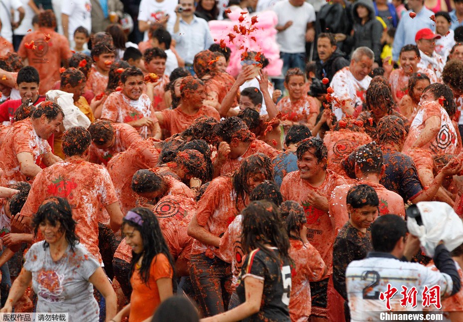 2012年6月10日,哥倫比亞波哥大,一年一度的“番茄大戰(zhàn)”激烈上演,人們在紅色的海洋里high翻天。