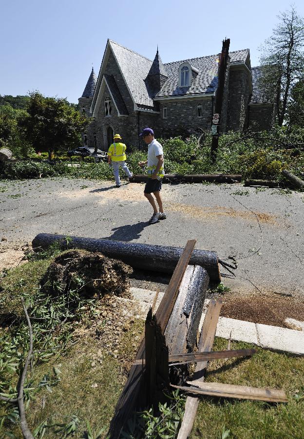 新華社照片,華盛頓,2012年6月30日 (國際)(9)美國東部遭受暴風雨襲擊6月30日,在美國首都華盛頓,工人清理在暴風雨中被風吹倒的大樹。 包括首都華盛頓在內的美國東部多個地區29日晚至30日早遭遇暴風雨天氣,造成3人死亡和大面積斷電,預計超過200萬人受到影響。新華社記者張軍攝