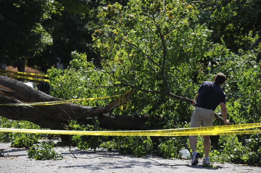 新華社照片,華盛頓,2012年6月30日 (國際)(5)美國東部遭受暴風雨襲擊6月30日,在美國首都華盛頓,一名當地居民清理被暴風雨吹落的樹枝。 包括首都華盛頓在內的美國東部多個地區29日晚至30日早遭遇暴風雨天氣,造成3人死亡和大面積斷電,預計超過200萬人受到影響。新華社記者張軍攝