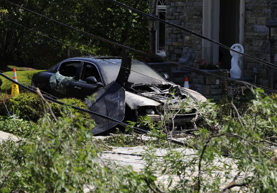 新華社照片,華盛頓,2012年6月30日 (國際)(10)美國東部遭受暴風雨襲擊6月30日,在美國首都華盛頓,一輛汽車在暴風雨中遭到嚴重損壞。 包括首都華盛頓在內的美國東部多個地區29日晚至30日早遭遇暴風雨天氣,造成3人死亡和大面積斷電,預計超過200萬人受到影響。新華社記者張軍攝