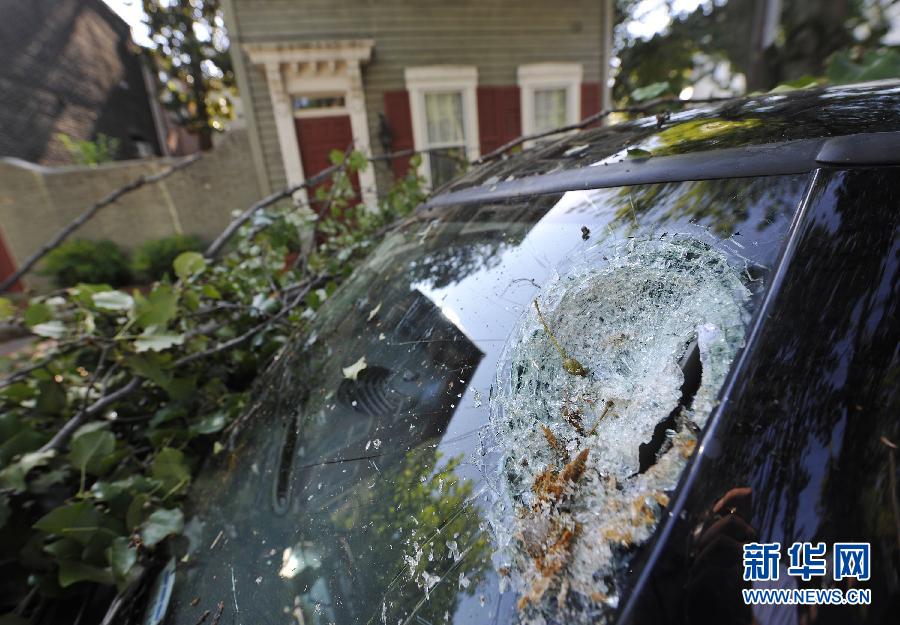 6月30日,在美國首都華盛頓,一輛汽車的擋風玻璃被樹砸壞。