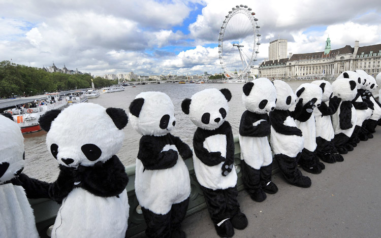 這些穿著黑白套裝扮演熊貓的表演者當天在考文特花園(Convent Garden)拉開首個“大熊貓關注周”的序幕,旨在引起人們關注這種瀕危動物的境況。