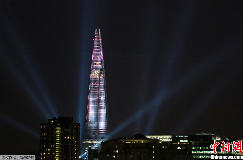 當?shù)貢r間2012年7月5日,英國倫敦,“碎片大廈”打出鐳射燈。這座歐洲最高的大樓即將在倫敦正式揭幕,將成為英國倫敦的新地標。據(jù)報道,該大廈聳立在倫敦橋附近,共有88層,高達310米,耗資15億英鎊,建設(shè)時間達12年。