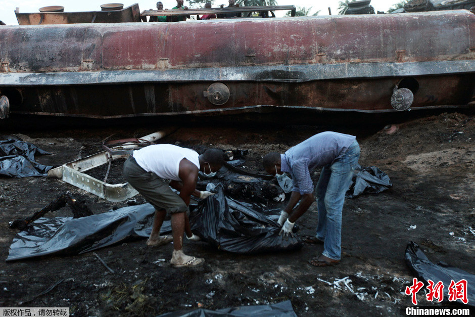 當(dāng)?shù)貢r(shí)間2012年7月12日,尼日利亞哈科特港,一輛運(yùn)送汽油的車(chē)輛發(fā)生事故并引發(fā)大火,目前已造成至少95人死亡。圖為救援人員在搬運(yùn)遇難者。