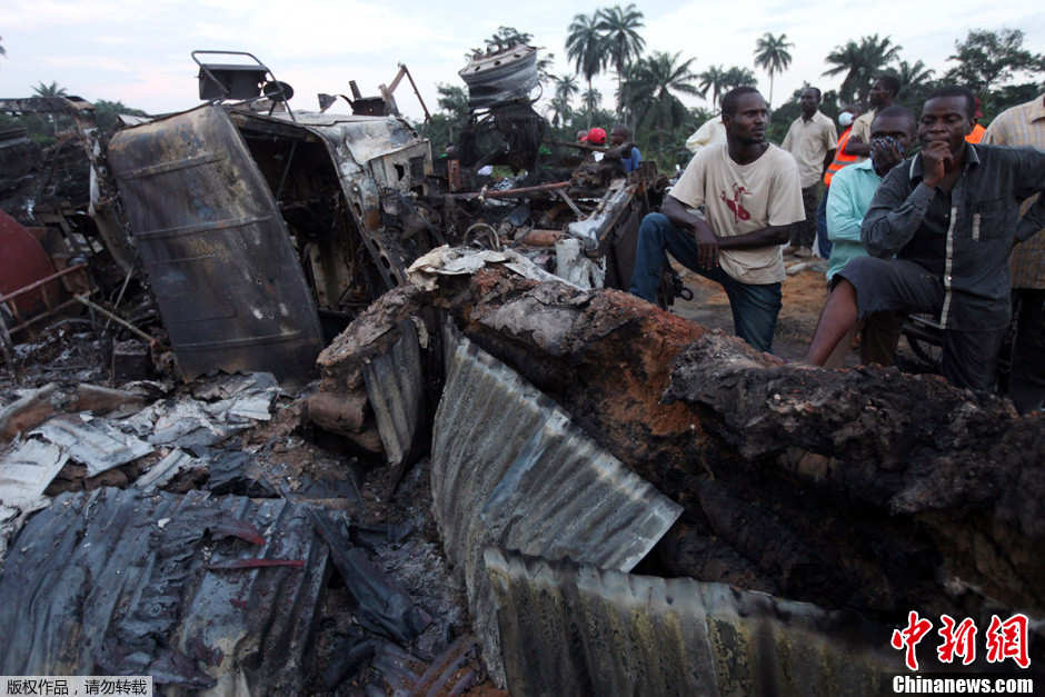當(dāng)?shù)貢r(shí)間2012年7月12日,尼日利亞哈科特港,一輛運(yùn)送汽油的車(chē)輛發(fā)生事故并引發(fā)大火,目前已造成至少95人死亡。圖為人們站在被燒毀的車(chē)輛旁。