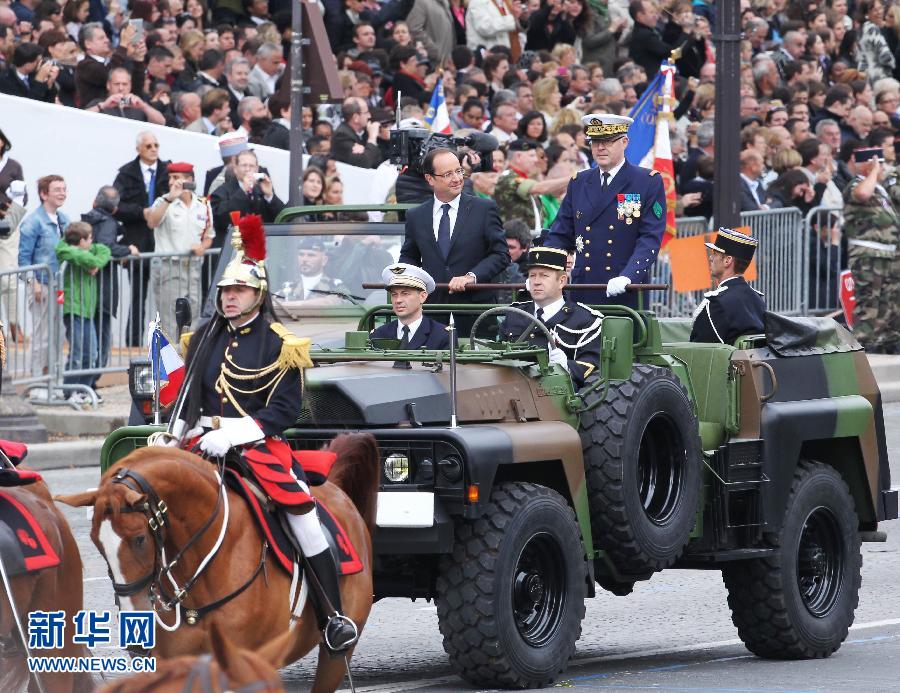 7月14日,在法國首都巴黎,法國總統奧朗德(站立者,左)出席國慶閱兵式。 當日,法國在巴黎香榭麗舍大街舉行盛大閱兵式,慶祝國慶日。新華社記者高靜攝